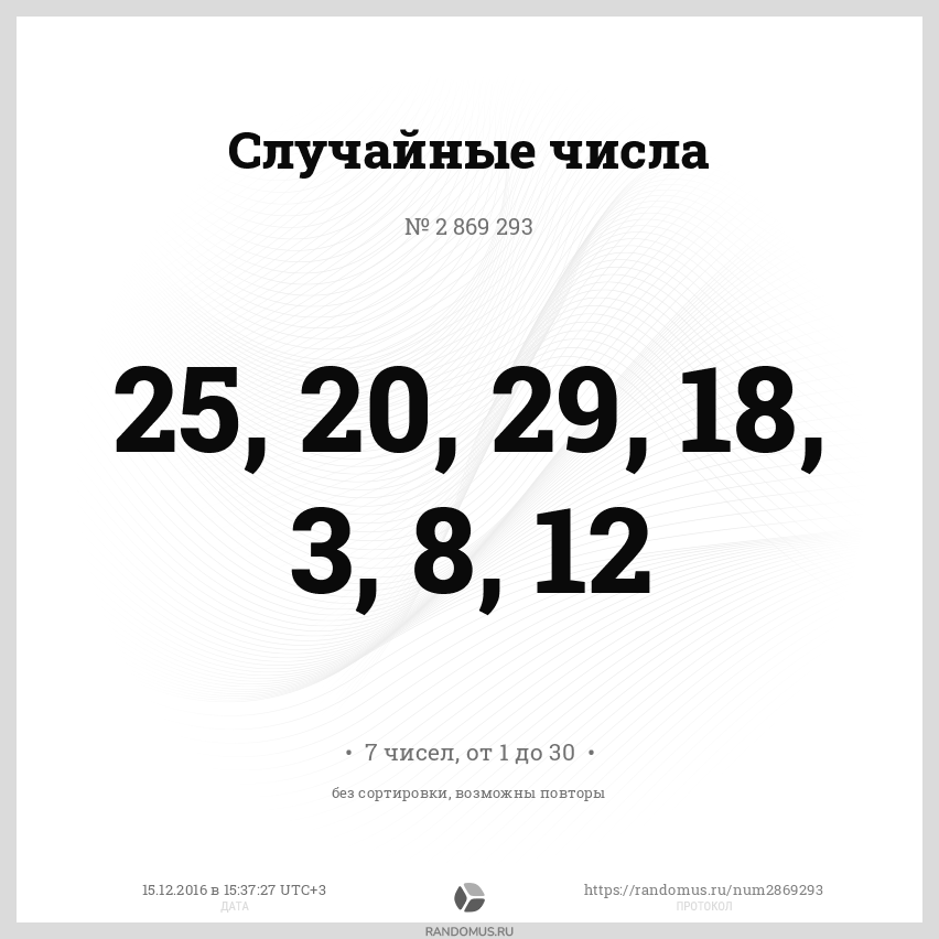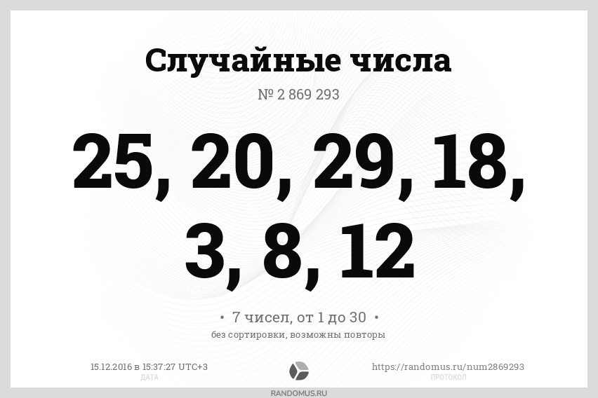 7 чисел в диапазоне от 1 до 30, без сортировки результатов, с возможными повторами |