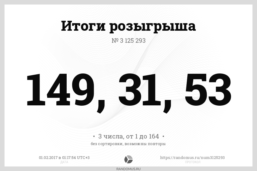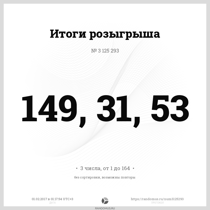 3 числа в диапазоне от 1 до 164, без сортировки результатов, с возможными повторами |