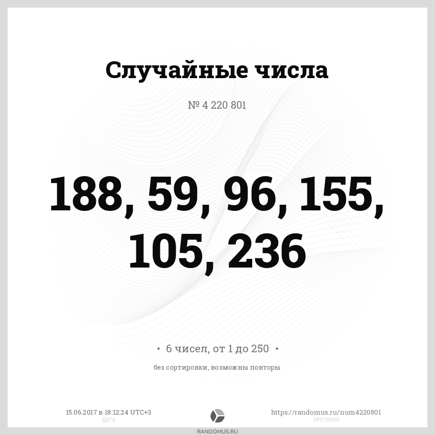 6 чисел в диапазоне от 1 до 250, без сортировки результатов, с возможными повторами |
