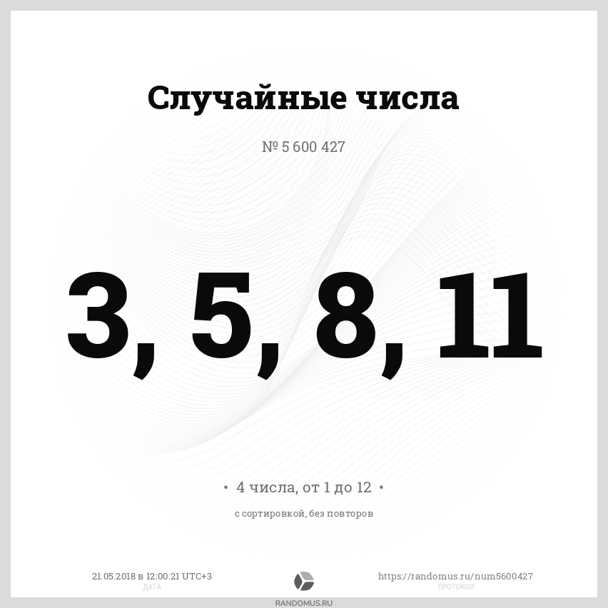 4 числа в диапазоне от 1 до 12, результаты упорядочены по порядку, без повторов |