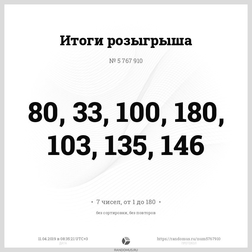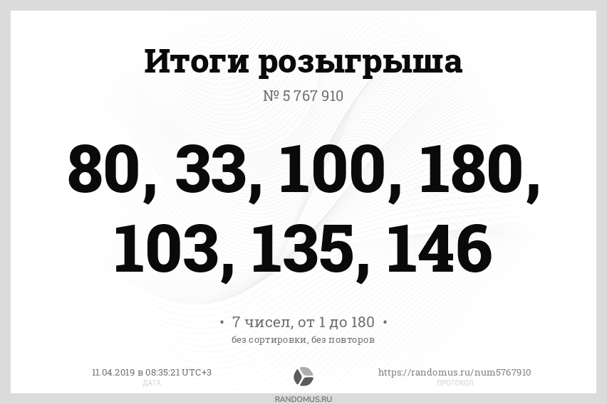 7 чисел в диапазоне от 1 до 180, без сортировки результатов, без повторов |